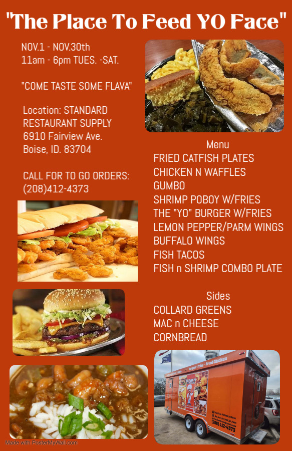 THE PLACE TO FEED YO FACE” will be posted all November @STANDARD RESTAURANT SUPPLY starting Sat. 11/1 ending on 11/30...6910 Fairview Ave. Boise, ID. 83704