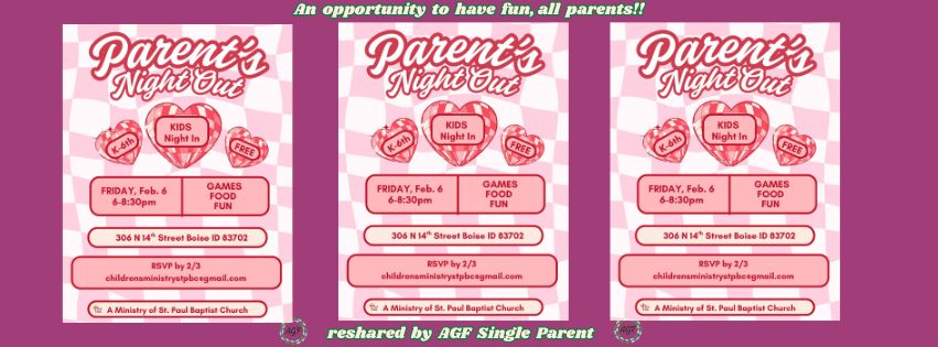 #singleparents #dads #moms #Friday #allparents Are there single Parent's group? #SingleParentsAreValuable #agf #Parentsnightout #StpaulBaptist #boise #children #choosetosucceedtoday There is a single parent support group.